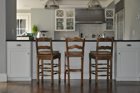 Here are my current wood counter stools with the Ballard Design toffee checked chair cushions. If you look closely you will see that the chairs are actually different. The two on the ends I bought at a discount many years ago because they were being discontinued by the manufacturer. When I needed an additional stool I bought a similar one from Ballard Designs.